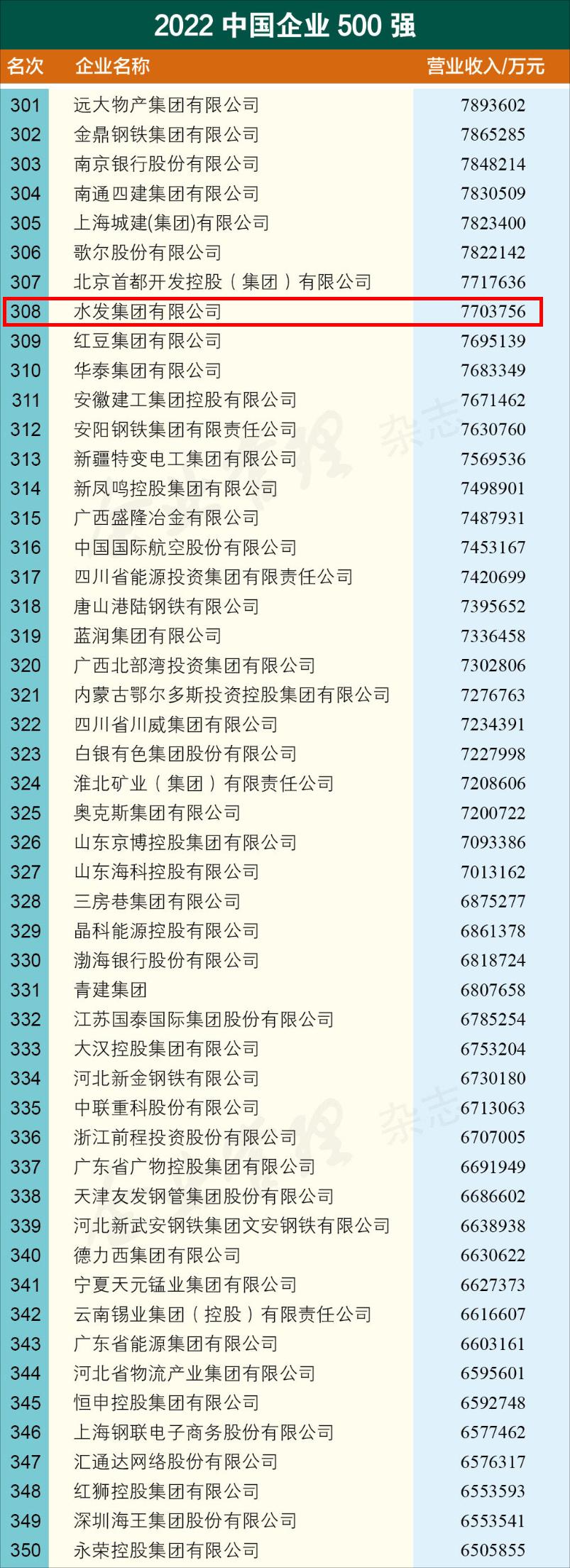 較去年提升126位!水發集團位列2022年中國企業500強第308位